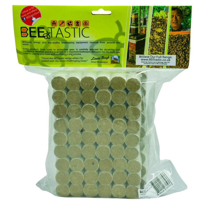 Each bag contains 2 packs of smoker pellets (108 total), designed for use with standard beekeeping smokers. Simply light a pellet and drop it into your smoker – each one burns for around 20 minutes, giving you consistent smoke output with minimal relighting.